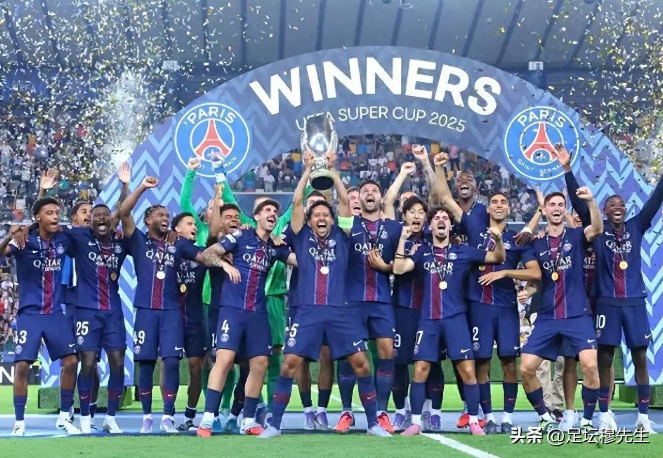 2025年,巴黎圣日耳曼以摧枯拉朽之势击败托特纳姆热刺,将欧洲超级杯冠军收入囊中,这也是他们本年度第五座冠军奖杯。如无意外,年底他们将有望比肩巴塞罗那和拜仁慕尼黑,成为足球史上第三支成就“六冠王”伟业的队伍。